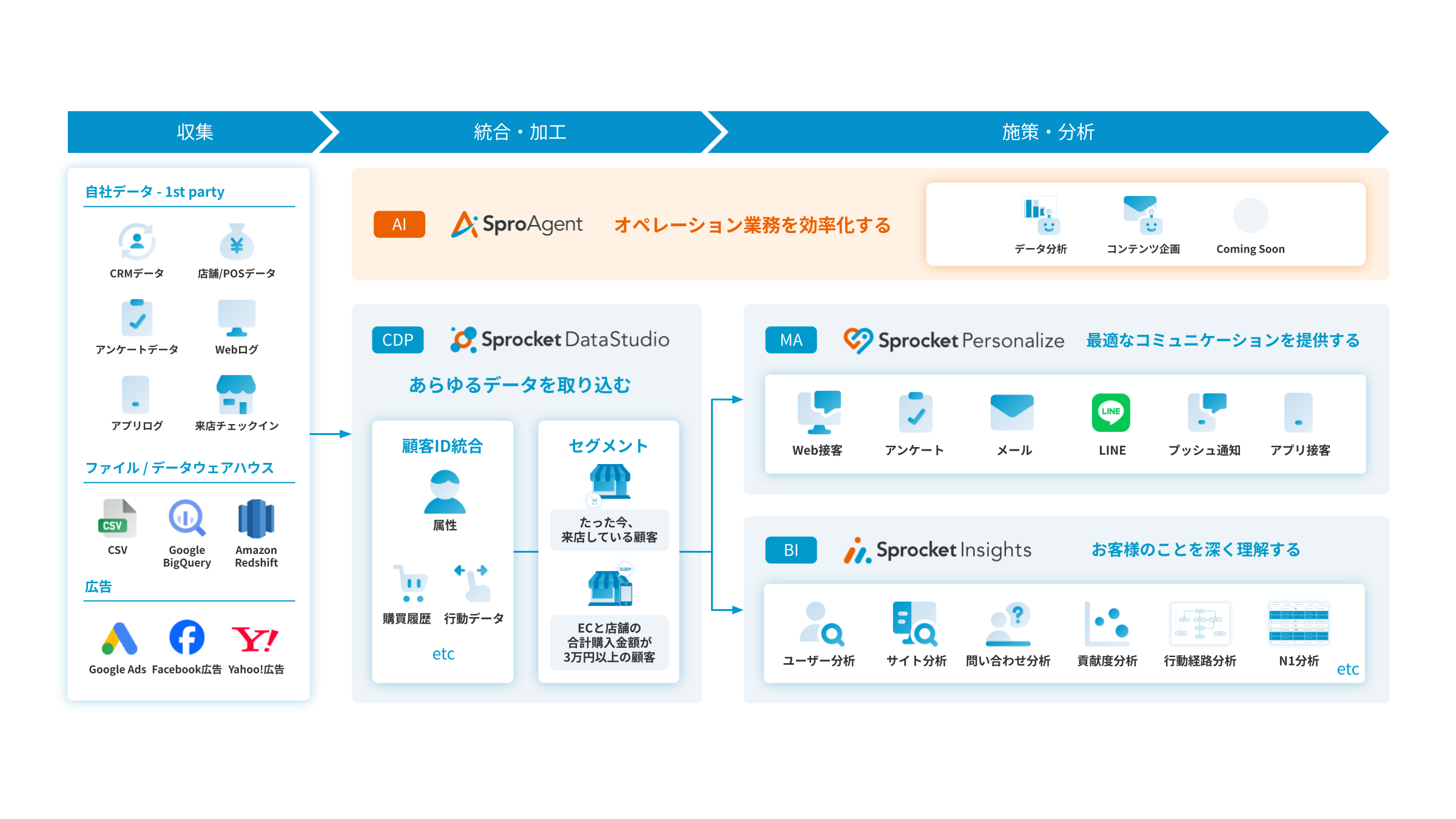 Sprocket DataStudioは、データの収集・統合・加工・集計・抽出といった、”データ活用” に必要な機能を兼ね備えたCDPです。あらゆるデータを統合し、パーソナライズされた分析や施策を実現できます。
