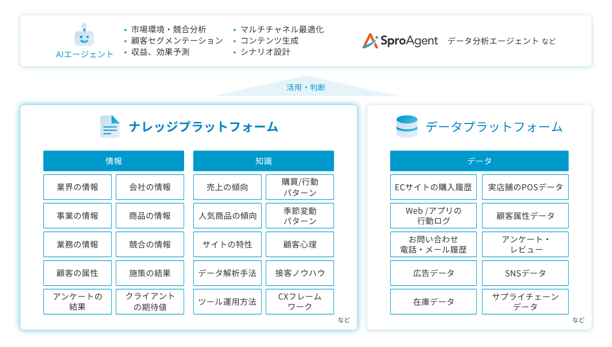当社は、全プロダクトおよびサービスにAI技術を統合し、機能強化を実現します。この構想はすでに着実に進行しており、2025年7月にリリースしたSproAgentのデータ分析エージェントでは、ナレッジプラットフォームとの連携を開始しています。単なるデータの可視化にとどまらず、業界特性や顧客心理を踏まえた深い洞察を含むアウトプットの生成が可能となり、分析結果の質が大幅に向上しています。