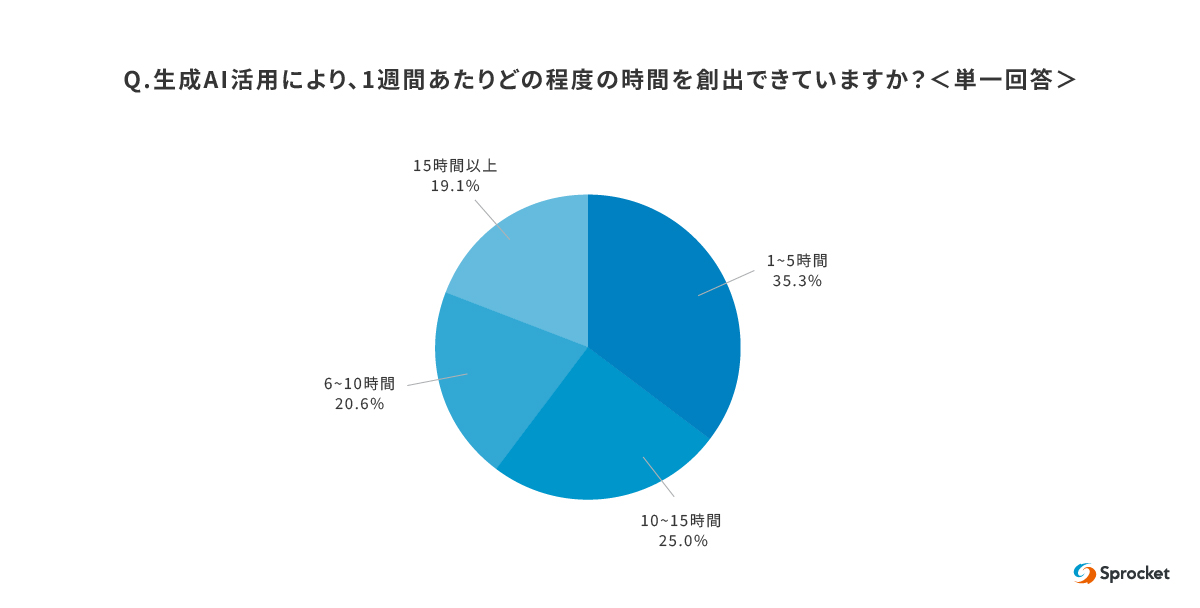 生成AI活用により1週間あたりどの程度の時間を創出できているかを尋ねたところ、「1~5時間」が35.3%で最多となりました。「10~15時間」25.0%、「6~10時間」20.6%と続き、「15時間以上」も19.1%に上りました。