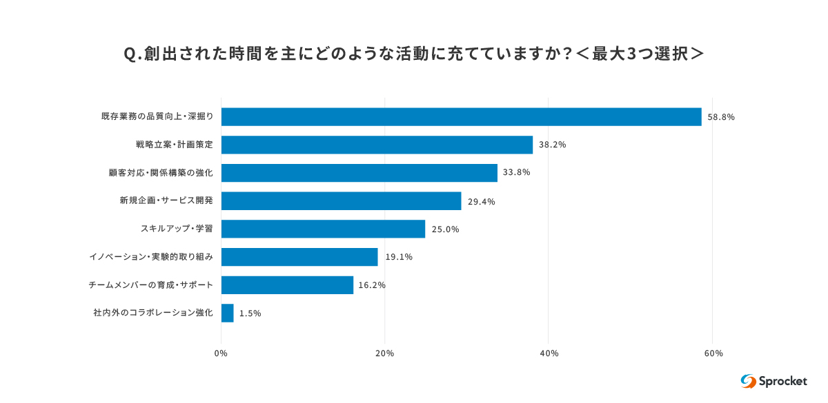 創出された時間を主にどのような活動に充てているかを最大3つ尋ねたところ、「既存業務の品質向上・深掘り」が58.8%で最多。「戦略立案・計画策定」38.2%、「顧客対応・関係構築の強化」33.8%と続きました。