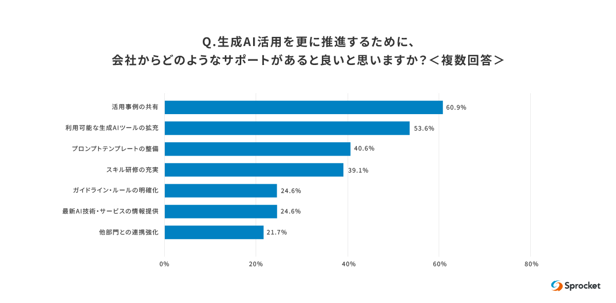 生成AI活用を更に推進するために会社からどのようなサポートがあると良いかを複数選択で尋ねたところ、「活用事例の共有」が60.9%で最多となりました。次いで「利用可能な生成AIツールの拡充」53.6%、「プロンプトテンプレートの整備」40.6%、「スキル研修の充実」39.1%と続きました。