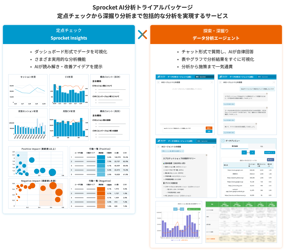 CX改善プラットフォームを提供する株式会社Sprocket(本社:東京都品川区、代表取締役:深田 浩嗣)は、Webサイトを対象としたデータ分析サービス「AI分析トライアルパッケージ」の提供を開始しました。定点チェックのダッシュボード「Sprocket Insights」とAIによる探索・深掘りできる「データ分析エージェント」を組み合わせ、分析スキルのない現場担当者でも自然言語で質問するだけで高度な分析と施策提案を実行できる環境を提供します。