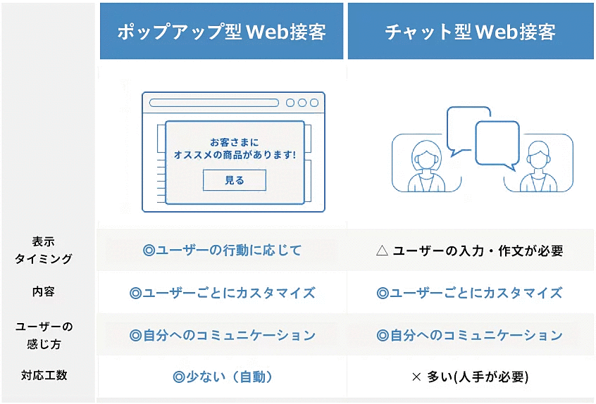 一般的にWeb接客ツールというと「ポップアップ型」と「チャット型」の2つがあります。それぞれの特徴についてご紹介します。